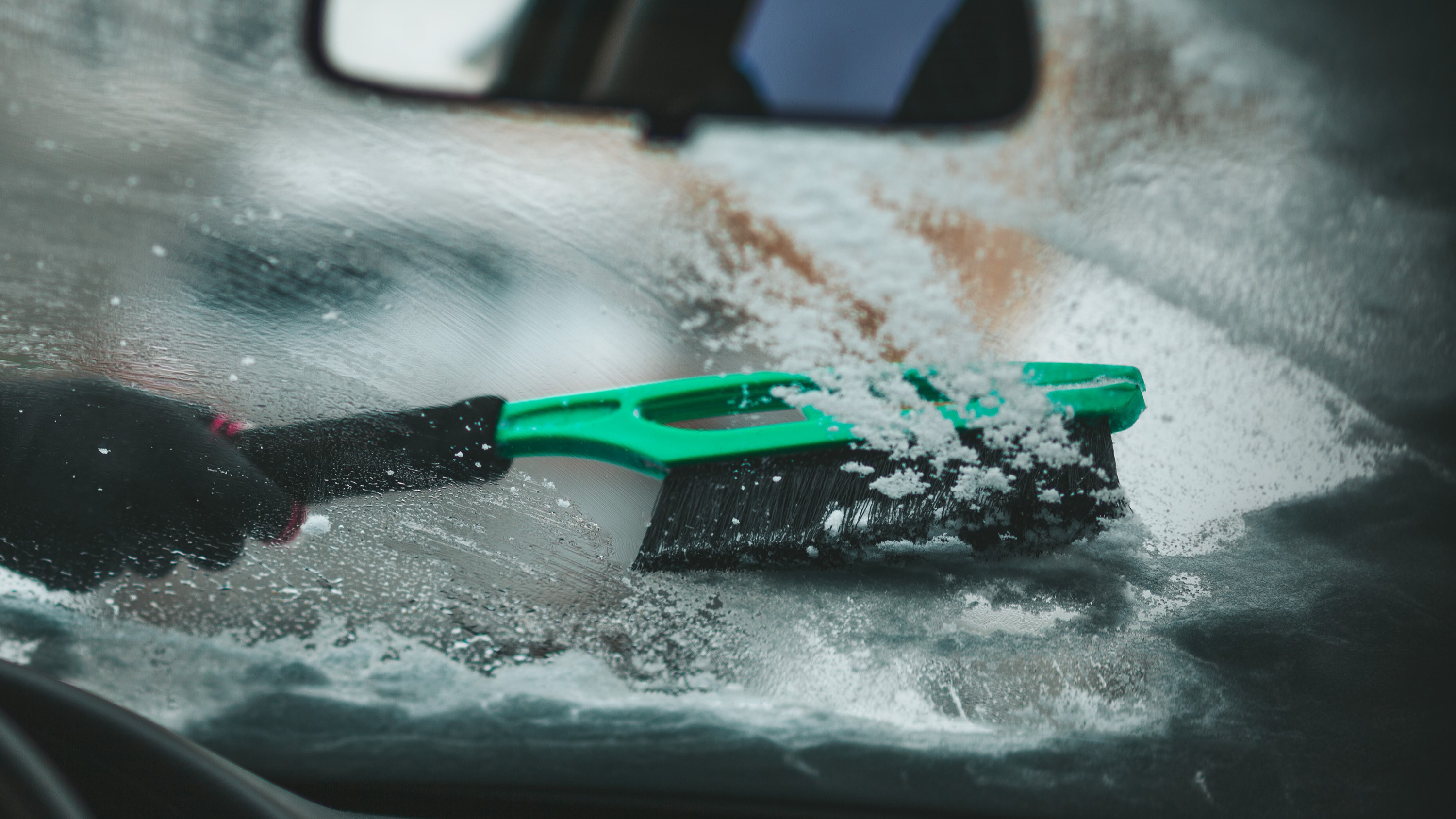 Equip your car with snow and ice removal tools like a snow brush, ice scraper, and a small bag of sand or cat litter for extra traction.