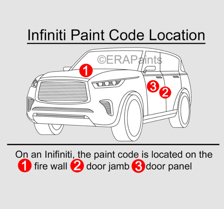 The paint code for your vehicle is going to be on the passenger-side firewall, door jamb, or the door panel. There will be a sticker that has your VIN number on it. You will look on the bottom left and see the word COLOR, under that, there will be a 3-digit code, which is the paint code that we will need to start your order. If you are still struggling to find the paint color, you are able to call the Infiniti dealership and provide them with your VIN number and they can provide you with your factory paint code.